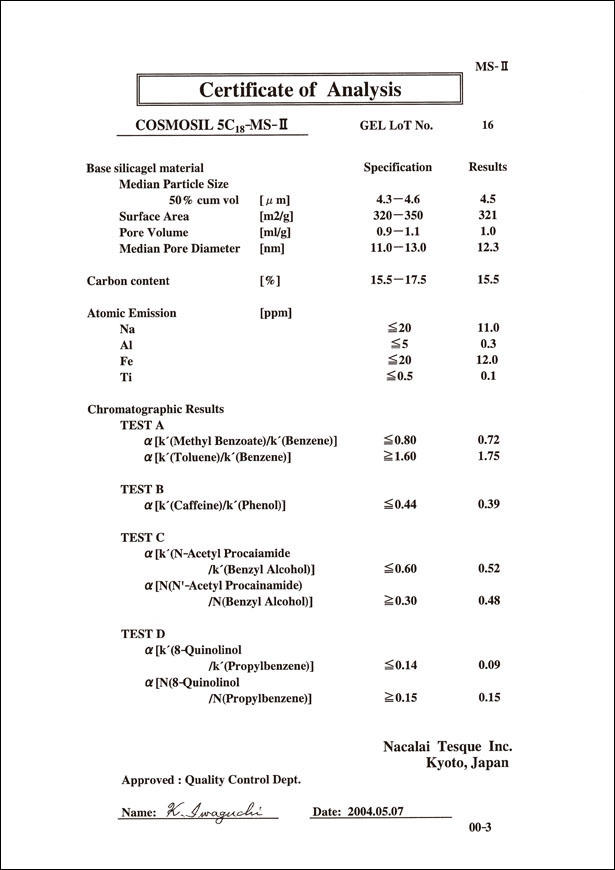 COSMOSIL Certificate of Analysis