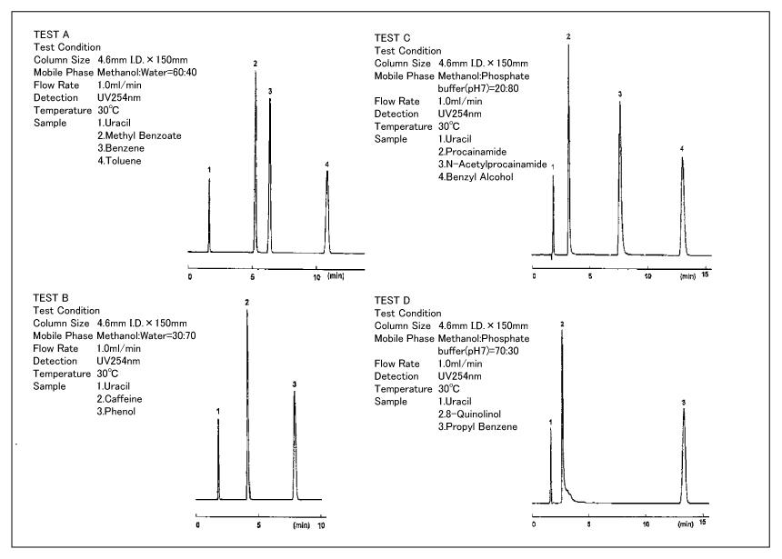 Tested items include physical properties of the silica gel, carbon content, metal content, polar selectivity, hydrophobicity, silanol capacity, steric selectivity, and inertness to basic and chelating compounds.