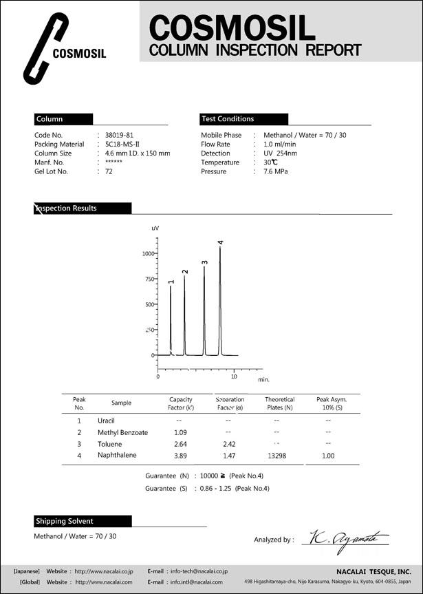 The strict quality control system of Nacalai Tesque supports customers with an individual Inspection Report, which accompanies each and every COSMOSIL, COSMOGEL, and COSMOCORE packed column (except guard columns), and an additional Certificate of Analysis for the packing material of the below products.