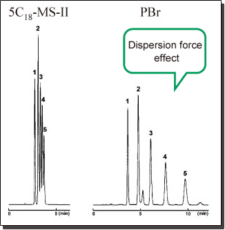 역상 크로마토그리피에서 화합물은 소수성의 차이로 분리합니다(CH2 의 수, 염기성 정도, 왼쪽(1)의 크로마토그램을 보십시오).소수성이 작은 화합물(OCH2CH2 그룹의 수, 오른쪽 (2)의 크로마토그램을 보십시오)은 C18 칼람에 잘 안 머뭅니다. 그러나, 이 화합물들은 COSMOSIL PBr 칼람을 이용할 때 분산력(Dispersion force) 상호작용에 의하여 쉽게 분리할 수 있습니다.